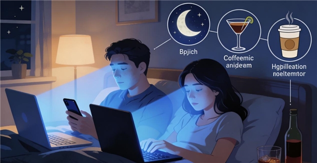 • 生活习惯:睡前刷短视频、看剧,手机蓝光“骗”大脑“还是白天”,褪黑素分泌减少;睡前喝可乐、咖啡,咖啡因在体内能留6-8小时,夜里还在“提神”;周末补觉到中午,周一生物钟直接“乱套”,晚上更难睡。
